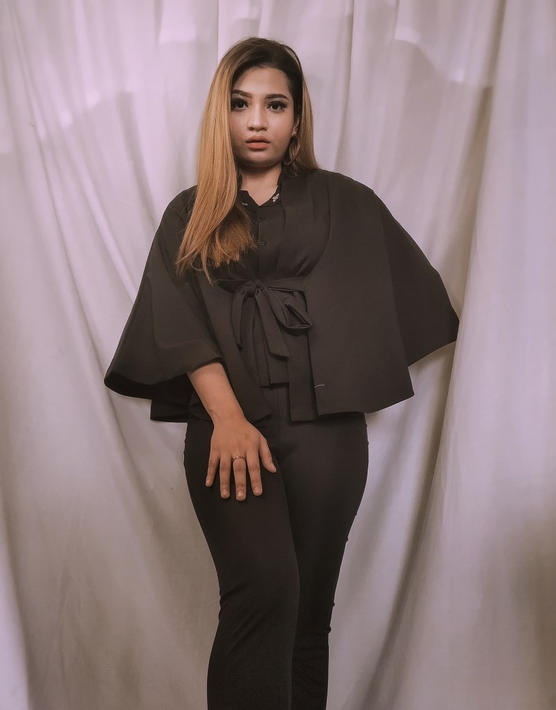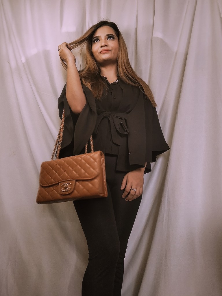 I have kept the entire outfit monotoned by pairing a black cape with black flared trousers. The cape sleeves and bell hem of the pants make for an interesting, statement combination. To add a pop of color, I accessorized the look with a pop orange handbag.