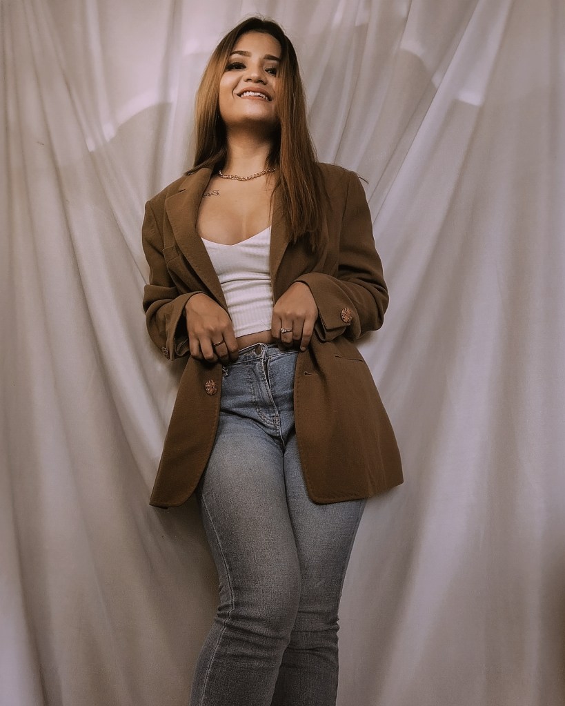 In this look, I styled a basic white cami top with baby blue flared denims and layered an oversized camel blazer to make the outfit more put together and polished.